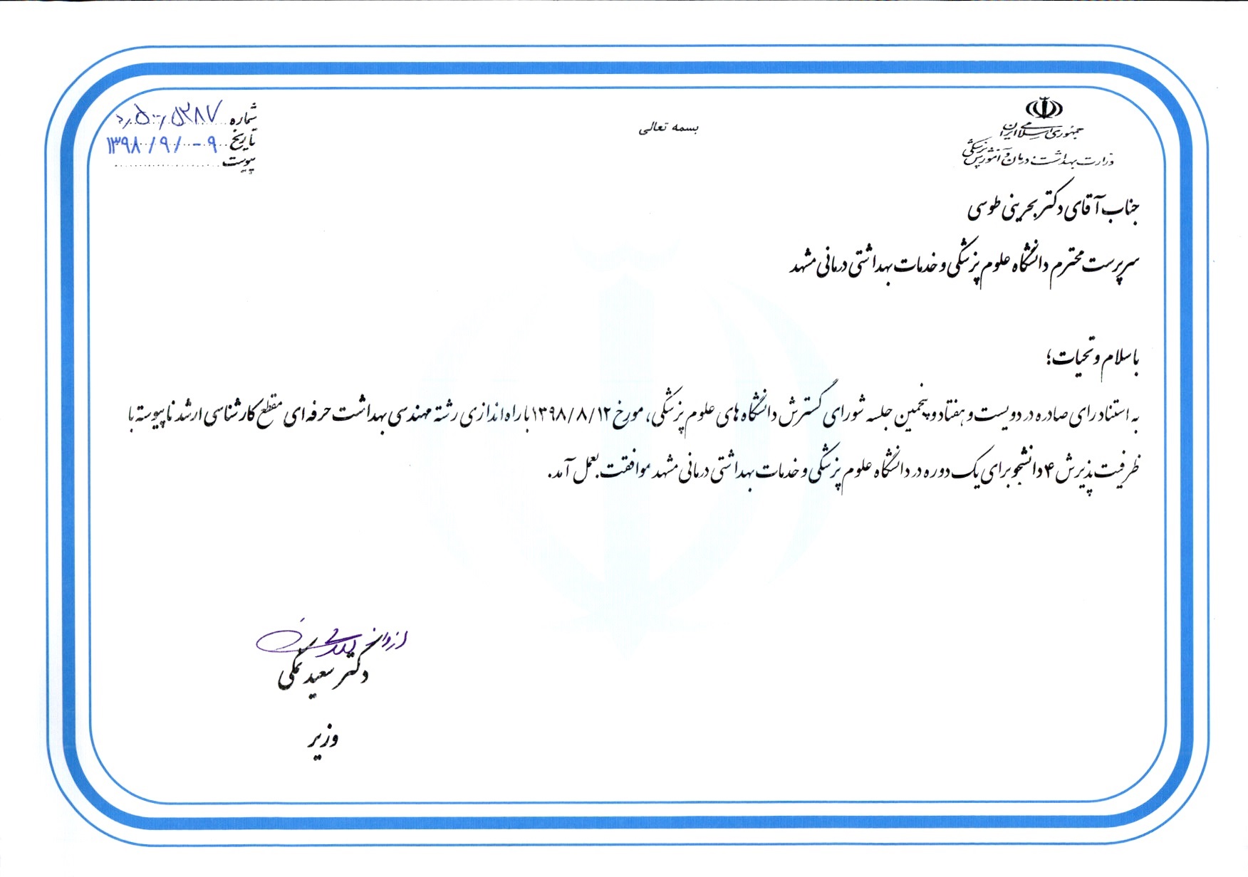 معصومه رستمی بدون مجموعه 03 تیر 1396 بازدید: 1358 امتیاز: ( 1 Rating ) مجوز جذب دانشجو امتیاز کاربران لطفا رای دهید رای 1 رای 2 رای 3 رای 4 رای 5 مجوز جذب دانشجوی کارشناسی ارشد مهندسی بهداشت حرفه ای و ایمنی کار