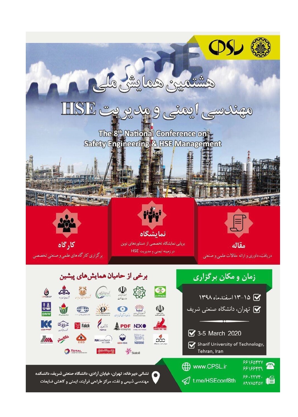 هشتمین همایش ملی مهندسی ایمنی و مدیریت HSE در تاریخ ۱۳ اسفند ۱۳۹۸ توسط مرکز طراحی فرآیند - ایمنی و کاهش ضایعات دانشگاه صنعتی شریف در شهر تهران برگزار خواهد شد.